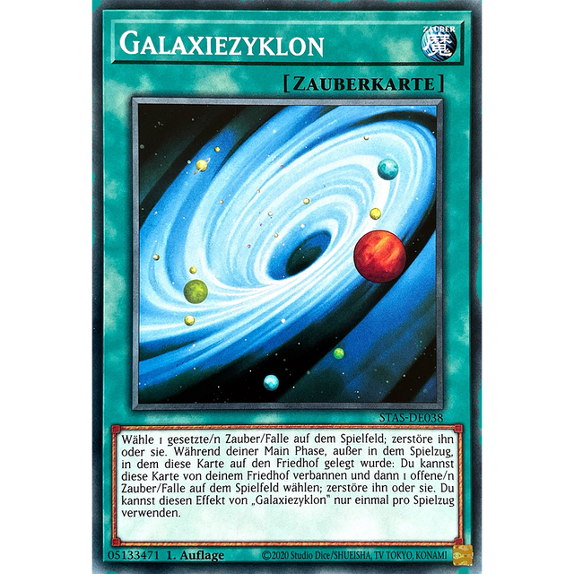 Wähle 1 gesetzte/n Zauber/Falle auf dem Spielfeld; zerstöre ihn oder sie. Während deiner Main Phase, außer in dem Spielzug, in dem diese Karte auf den Friedhof gelegt wurde: Du kannst diese Karte von deinem Friedhof verbannen und dann 1 offene/n Zauber/Falle auf dem Spielfeld wählen; zerstöre ihn oder sie. Du kannst diesen Effekt von „Galaxiezyklon“ nur einmal pro Spielzug verwenden.