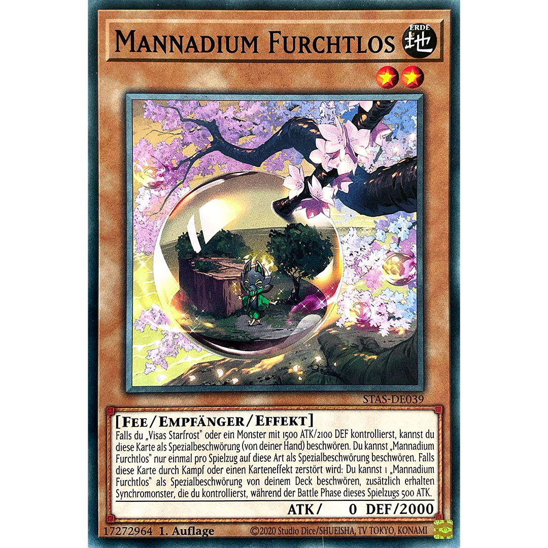 Falls du „Visas Starfrost“ oder ein Monster mit 1500 ATK/2100 DEF kontrollierst, kannst du diese Karte als Spezialbeschwörung (von deiner Hand) beschwören. Du kannst „Mannadium Furchtlos“ nur einmal pro Spielzug auf diese Art als Spezialbeschwörung beschwören. Falls diese Karte durch Kampf oder einen Karteneffekt zerstört wird: Du kannst 1 „Mannadium Furchtlos“ als Spezialbeschwörung von deinem Deck beschwören, zusätzlich erhalten Synchromonster, die du kontrollierst, während der Battle Phase dieses Spielzugs 500 ATK.