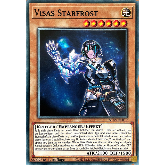 Falls sich diese Karte in deiner Hand befindet: Du kannst 1 Monster wählen, das du kontrollierst und das einen unterschiedlichen Typ und eine unterschiedliche Eigenschaft als diese Karte hat; zerstöre jenes Monster und falls du dies tust, beschwöre diese Karte als Spezialbeschwörung. Du kannst diesen Effekt von „Visas Starfrost“ nur einmal pro Spielzug verwenden. Wenn diese Karte ein Monster eines Gegners durch Kampf zerstört: Du kannst diese Karte ATK in Höhe der Hälfte der Grund-ATK oder -DEF jenes Monsters erhalten lassen (was davon höher ist, bei Gleichstand bestimmst du).