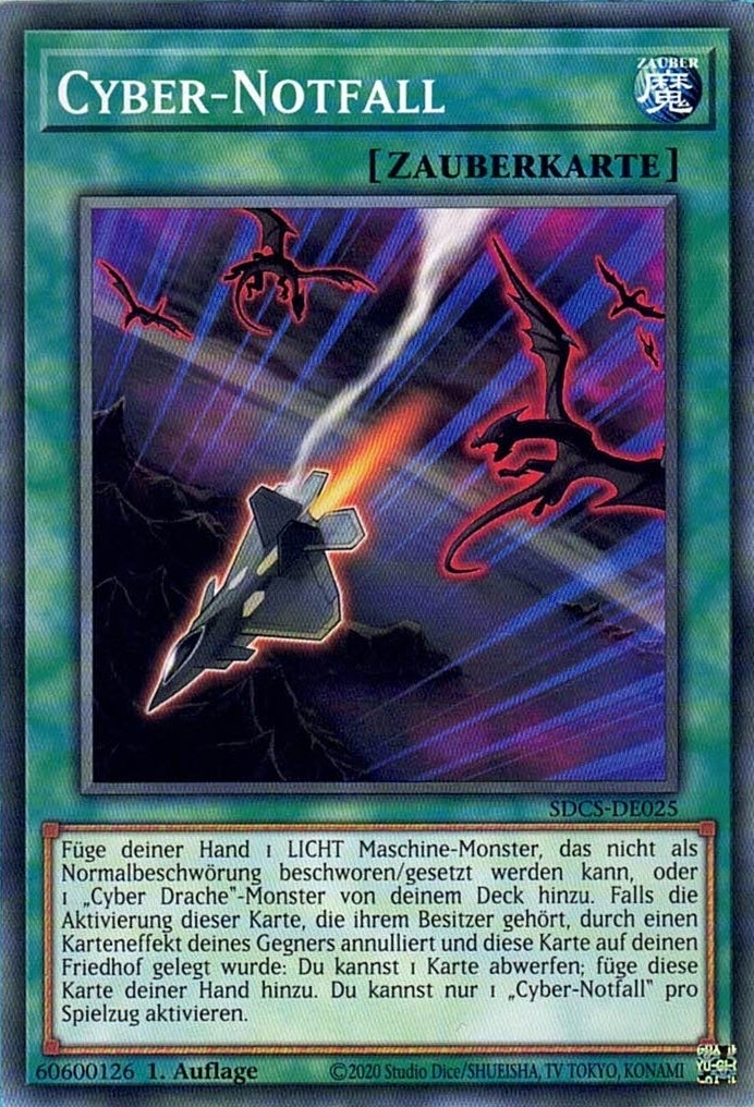 Füge deiner Hand 1 LICHT Maschine-Monster, das nicht als Normalbeschwörung beschworen/gesetzt werden kann, oder 1 „Cyber Drache“-Monster von deinem Deck hinzu. Falls die Aktivierung dieser Karte, die ihrem Besitzer gehört, durch einen Karteneffekt deines Gegners annulliert und diese Karte auf deinen Friedhof gelegt wurde: Du kannst 1 Karte abwerfen; füge diese Karte deiner Hand hinzu. Du kannst nur 1 „Cyber-Notfall“ pro Spielzug aktivieren.