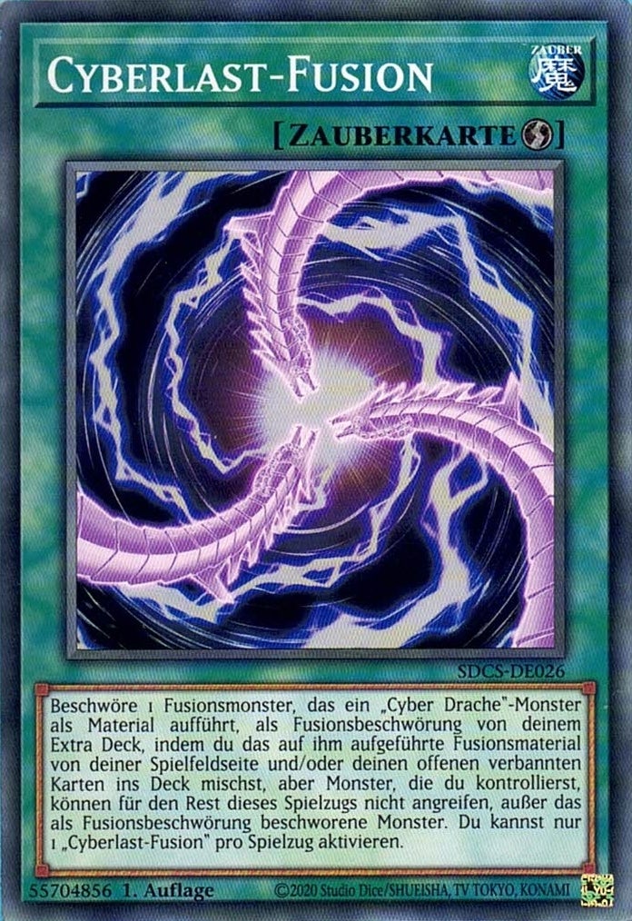 Beschwöre 1 Fusionsmonster, das ein „Cyber Drache“-Monster als Material aufführt, als Fusionsbeschwörung von deinem Extra Deck, indem du das auf ihm aufgeführte Fusionsmaterial von deiner Spielfeldseite und/oder deinen offenen verbannten Karten ins Deck mischst, aber Monster, die du kontrollierst, können für den Rest dieses Spielzugs nicht angreifen, außer das als Fusionsbeschwörung beschworene Monster. Du kannst nur 1 „Cyberlast-Fusion“ pro Spielzug aktivieren.