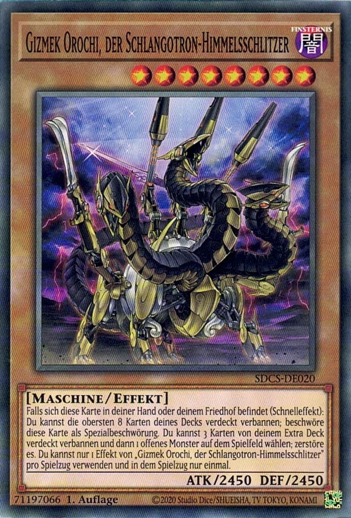 Falls sich diese Karte in deiner Hand oder deinem Friedhof befindet (Schnelleffekt): Du kannst die obersten 8 Karten deines Decks verdeckt verbannen; beschwöre diese Karte als Spezialbeschwörung. Du kannst 3 Karten von deinem Extra Deck verdeckt verbannen und dann 1 offenes Monster auf dem Spielfeld wählen; zerstöre es. Du kannst nur 1 Effekt von „Gizmek Orochi, der Schlangotron-Himmelsschlitzer“ pro Spielzug verwenden und in dem Spielzug nur einmal.