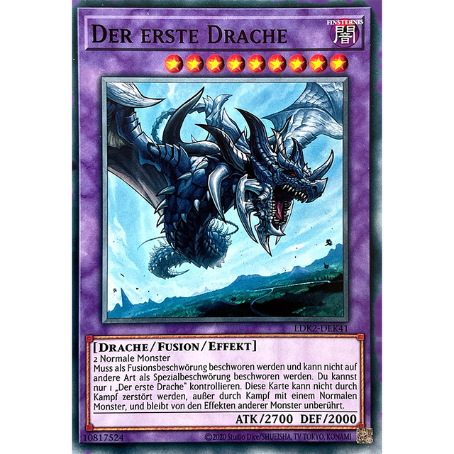 Muss als Fusionsbeschwörung beschworen werden und kann nicht auf andere Art als Spezialbeschwörung beschworen werden. Du kannst nur 1 „Der erste Drache“ kontrollieren. Diese Karte kann nicht durch Kampf zerstört werden, außer durch Kampf mit einem Normalen Monster, und bleibt von den Effekten anderer Monster unberührt.