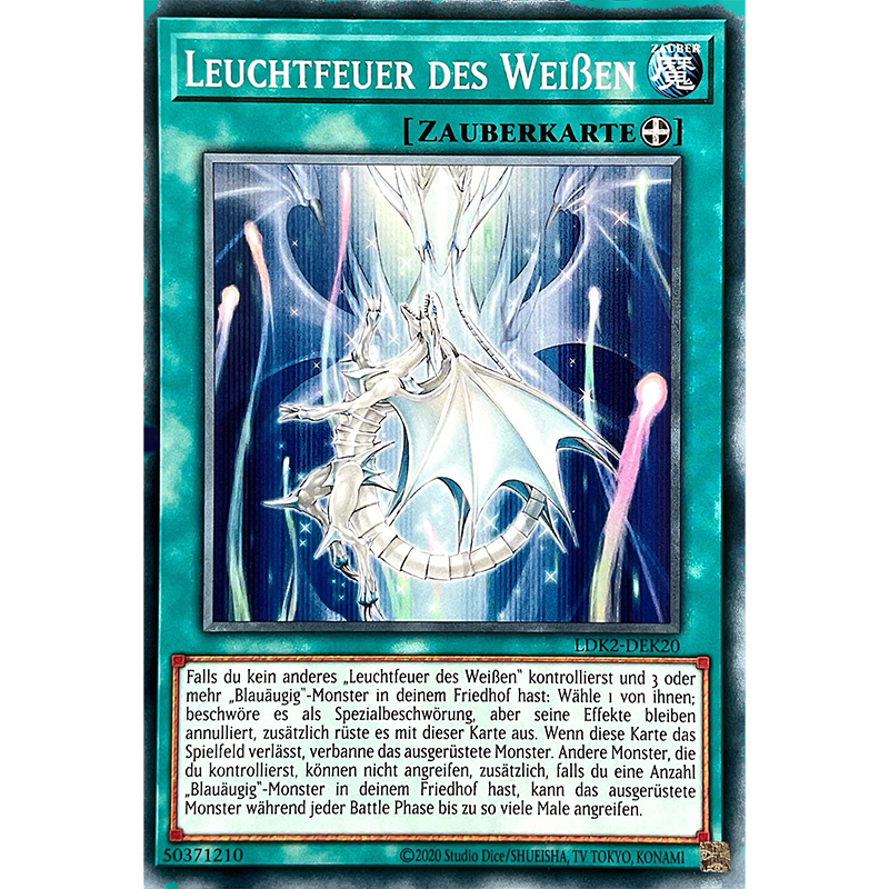 Falls du kein anderes „Leuchtfeuer des Weißen“ kontrollierst und 3 oder mehr „Blauäugig“-Monster in deinem Friedhof hast: Wähle 1 von ihnen; beschwöre es als Spezialbeschwörung, aber annulliere seine Effekte, zusätzlich rüste es mit dieser Karte aus. Wenn diese Karte das Spielfeld verlässt, verbanne das ausgerüstete Monster. Andere Monster, die du kontrollierst, können nicht angreifen, zusätzlich, falls du eine beliebige Anzahl „Blauäugig“-Monster in deinem Friedhof hast, kann das ausgerüstete Monster während jeder Battle Phase bis zu so viele Male angreifen.