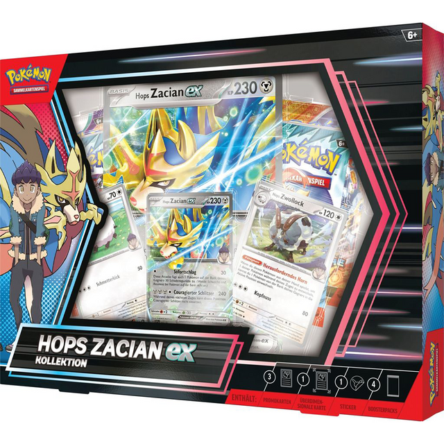 Zwei Galar-Größen formen ein Team! Hop und Zacian bilden ein dynamisches Duo, das sich den Titel „Rivale“ wahrlich verdient hat! Hops Zacian-ex’ Attacke Sofortschlag greift das Aktive Pokémon deines Gegners und ein Pokémon auf seiner Bank an, während Couragierter Schlitzer gewaltigen Schaden austeilt! Mit Hops Zacian-ex an deiner Seite sind deine Kämpfe auch während der finstersten Nächte sensationell. Doch Hops Team hat noch mehr zu bieten – Hops Wolly und Hops Zwollock runden das Set wunderbar ab. Sollte das nicht reichen, findest du weitere Pokémon in den vier enthaltenen Boosterpacks.