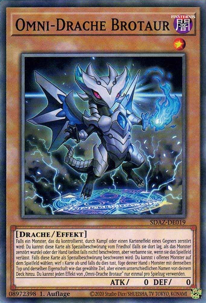 Falls ein Monster, das du kontrollierst, durch Kampf oder einen Karteneffekt eines Gegners zerstört wird: Du kannst diese Karte als Spezialbeschwörung vom Friedhof (falls sie dort lag, als das Monster zerstört wurde) oder der Hand (selbst falls nicht) beschwören, aber verbanne sie, wenn sie das Spielfeld verlässt. Falls diese Karte als Spezialbeschwörung beschworen wird: Du kannst 1 offenes Monster auf dem Spielfeld wählen; wirf 1 Karte ab und falls du dies tust, füge deiner Hand 1 Monster mit demselben Typ und derselben Eigenschaft wie das gewählte Ziel, aber einem unterschiedlichen Namen von deinem Deck hinzu. Du kannst jeden Effekt von „Omni-Drache Brotaur“ nur einmal pro Spielzug verwenden.
