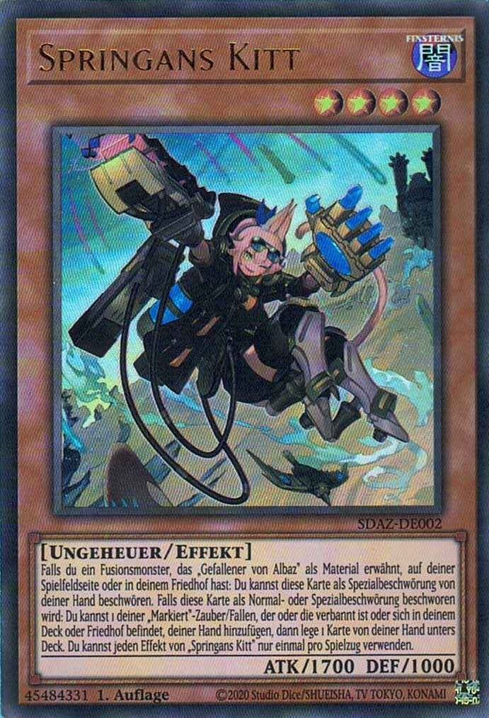 Falls du ein Fusionsmonster, das „Gefallener von Albaz“ als Material erwähnt, auf deiner Spielfeldseite oder in deinem Friedhof hast: Du kannst diese Karte als Spezialbeschwörung von deiner Hand beschwören. Falls diese Karte als Normal- oder Spezialbeschwörung beschworen wird: Du kannst 1 deiner „Markiert“-Zauber/Fallen, der oder die verbannt ist oder sich in deinem Deck oder Friedhof befindet, deiner Hand hinzufügen, dann lege 1 Karte von deiner Hand unters Deck. Du kannst jeden Effekt von „Springans Kitt“ nur einmal pro Spielzug verwenden.