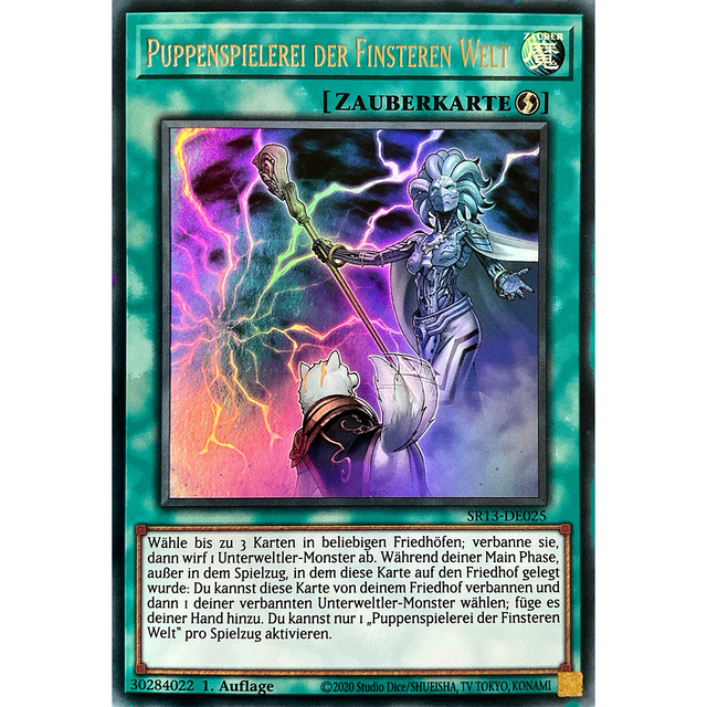 Wähle bis zu 3 Karten in beliebigen Friedhöfen; verbanne sie, dann wirf 1 Unterweltler-Monster ab. Während deiner Main Phase, außer in dem Spielzug, in dem diese Karte auf den Friedhof gelegt wurde: Du kannst diese Karte von deinem Friedhof verbannen und dann 1 deiner verbannten Unterweltler-Monster wählen; füge es deiner Hand hinzu. Du kannst nur 1 „Puppenspielerei der Finsteren Welt“ pro Spielzug aktivieren.