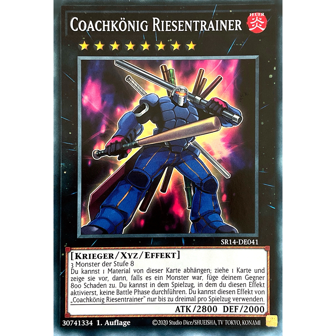 Du kannst 1 Material von dieser Karte abhängen; ziehe 1 Karte und zeige sie vor, dann, falls es ein Monster war, füge deinem Gegner 800 Schaden zu. Du kannst in dem Spielzug, in dem du diesen Effekt aktivierst, keine Battle Phase durchführen. Du kannst diesen Effekt von „Coachkönig Riesentrainer“ nur bis zu dreimal pro Spielzug verwenden.