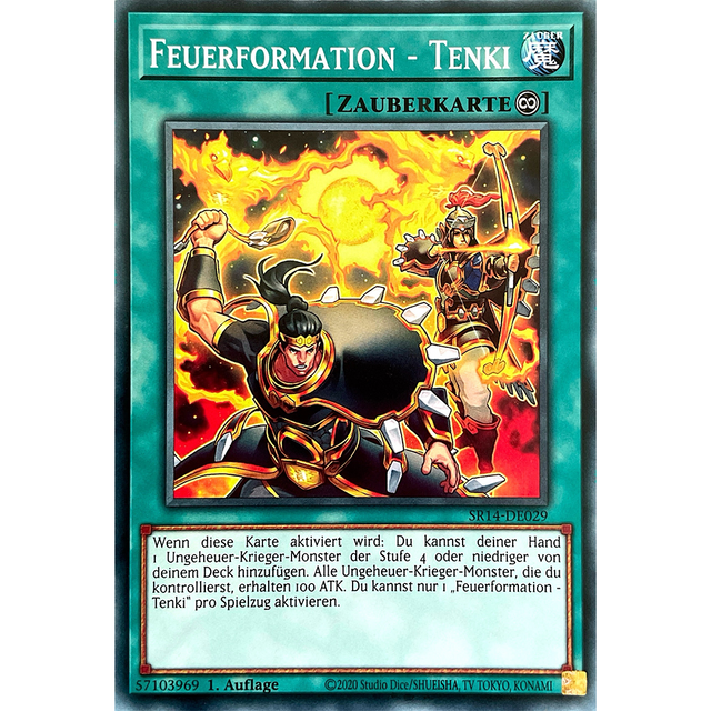Wenn diese Karte aktiviert wird: Du kannst deiner Hand 1 Ungeheuer-Krieger-Monster der Stufe 4 oder niedriger von deinem Deck hinzufügen. Alle Ungeheuer-Krieger-Monster, die du kontrollierst, erhalten 100 ATK. Du kannst nur 1 „Feuerformation - Tenki“ pro Spielzug aktivieren.