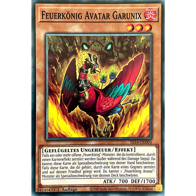 Falls ein oder mehr offene „Feuerkönig“-Monster, die du kontrollierst, durch einen Karteneffekt zerstört werden (außer während des Damage Steps): Du kannst diese Karte als Spezialbeschwörung von deiner Hand beschwören. Falls diese Karte, die dir gehört, durch eine Karte eines Gegners zerstört und auf deinen Friedhof gelegt wird: Du kannst 1 „Feuerkönig Avatar“-Monster als Spezialbeschwörung von deinem Deck beschwören.