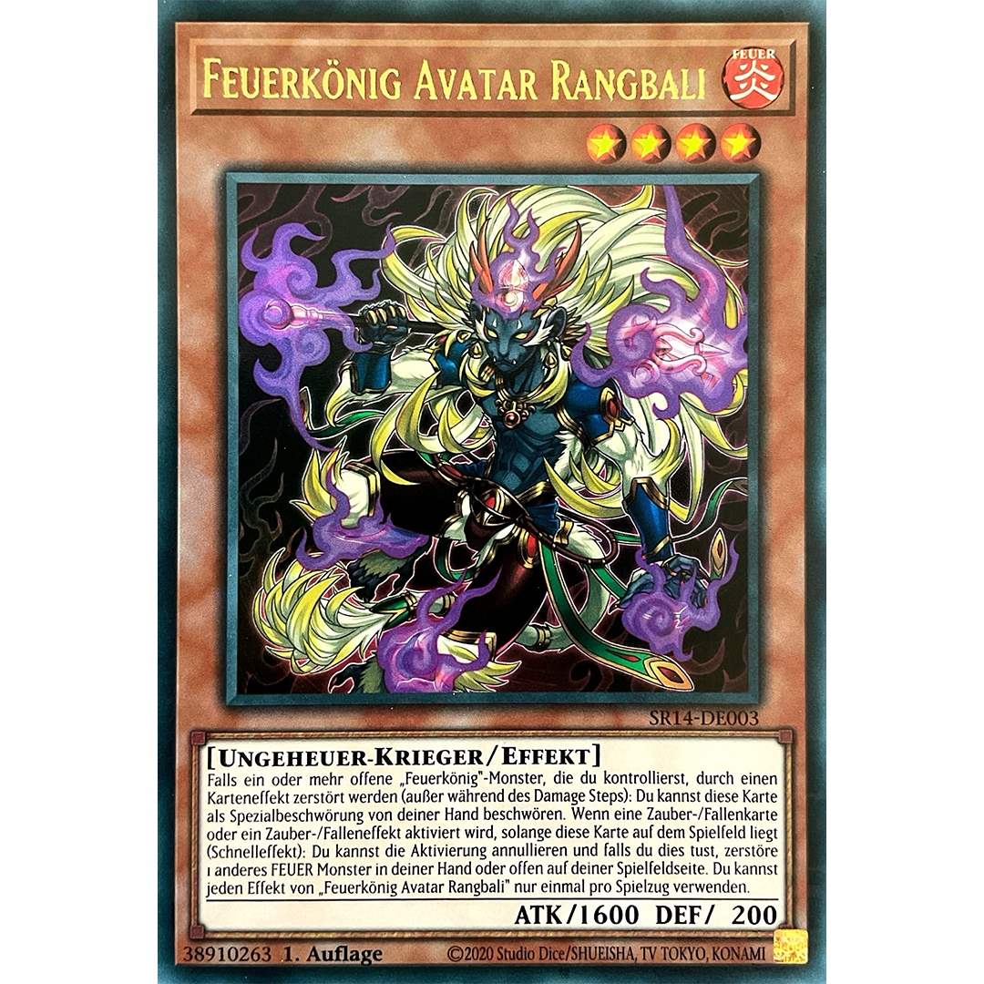 Falls ein oder mehr offene „Feuerkönig“-Monster, die du kontrollierst, durch einen Karteneffekt zerstört werden (außer während des Damage Steps): Du kannst diese Karte als Spezialbeschwörung von deiner Hand beschwören. Wenn eine Zauber-/Fallenkarte oder ein Zauber-/Falleneffekt aktiviert wird, solange diese Karte auf dem Spielfeld liegt (Schnelleffekt): Du kannst die Aktivierung annullieren und falls du dies tust, zerstöre 1 anderes FEUER Monster in deiner Hand oder offen auf deiner Spielfeldseite. Du kannst jeden Effekt von „Feuerkönig Avatar Rangbali“ nur einmal pro Spielzug verwenden.