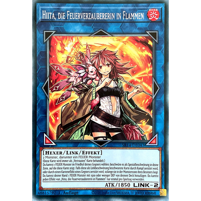 Du kannst 1 FEUER Monster im Friedhof deines Gegners wählen; beschwöre es als Spezialbeschwörung in deine Zone, auf die diese Karte zeigt. Falls diese als Linkbeschwörung beschworene Karte durch Kampf zerstört wird, oder durch einen Karteneffekt eines Gegners zerstört wird, solange sie in der Monsterzone ihres Besitzers liegt: Du kannst deiner Hand 1 FEUER Monster mit 1500 oder weniger DEF von deinem Deck hinzufügen. Du kannst jeden Effekt von „Hiita, die Feuerverzaubererin in Flammen“ nur einmal pro Spielzug verwenden.