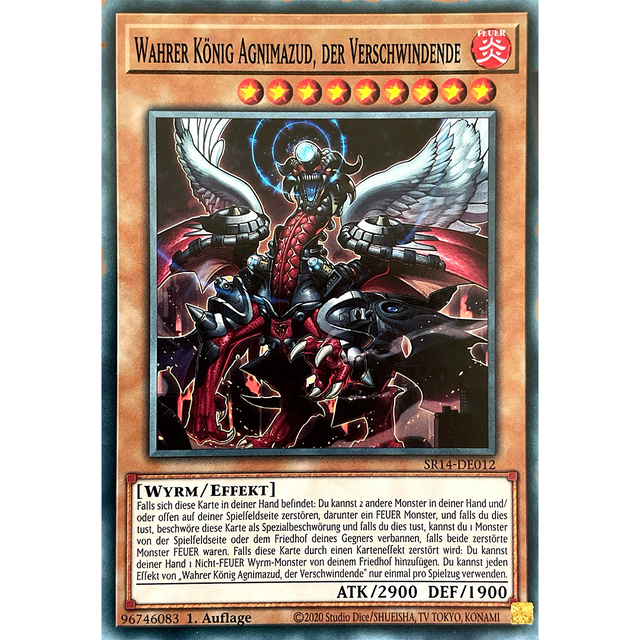 Falls sich diese Karte in deiner Hand befindet: Du kannst 2 andere Monster in deiner Hand und/oder offen auf deiner Spielfeldseite zerstören, darunter ein FEUER Monster, und falls du dies tust, beschwöre diese Karte als Spezialbeschwörung und falls du dies tust, kannst du 1 Monster von der Spielfeldseite oder dem Friedhof deines Gegners verbannen, falls beide zerstörte Monster FEUER waren. Falls diese Karte durch einen Karteneffekt zerstört wird: Du kannst deiner Hand 1 Nicht-FEUER Wyrm-Monster von deinem Friedhof hinzufügen. Du kannst jeden Effekt von „Wahrer König Agnimazud, der Verschwindende“ nur einmal pro Spielzug verwenden.