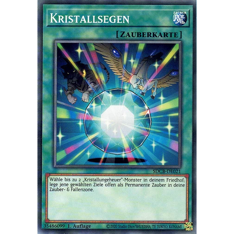Wähle bis zu 2 „Kristallungeheuer“-Monster in deinem Friedhof; lege jene gewählten Ziele offen als Permanente Zauber in deine Zauber- & Fallenzone.