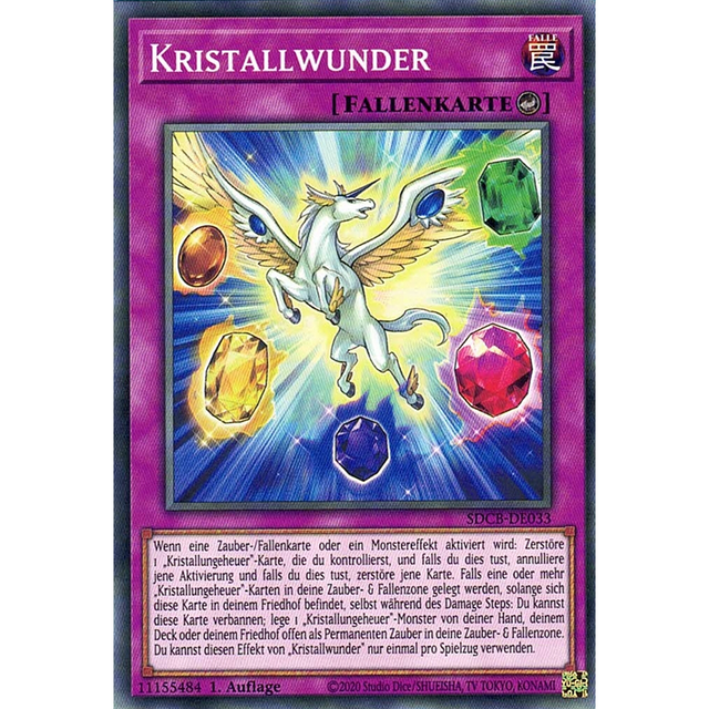 Wenn eine Zauber-/Fallenkarte oder ein Monstereffekt aktiviert wird: Zerstöre 1 „Kristallungeheuer“-Karte, die du kontrollierst, und falls du dies tust, annulliere jene Aktivierung und falls du dies tust, zerstöre jene Karte. Falls eine oder mehr „Kristallungeheuer“-Karten in deine Zauber- & Fallenzone gelegt werden, solange sich diese Karte in deinem Friedhof befindet, selbst während des Damage Steps: Du kannst diese Karte verbannen; lege 1 „Kristallungeheuer“-Monster von deiner Hand, deinem Deck oder deinem Friedhof offen als Permanenten Zauber in deine Zauber- & Fallenzone. Du kannst diesen Effekt von „Kristallwunder“ nur einmal pro Spielzug verwenden.
