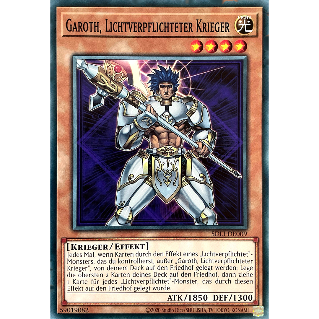 Falls eine oder mehr Karten durch den Effekt eines „Lichtverpflichtet“-Monsters, das du kontrollierst, außer „Garoth, Lichtverpflichteter Krieger“, von deinem Deck auf den Friedhof gelegt werden: Lege die obersten 2 Karten deines Decks auf den Friedhof, dann ziehe 1 Karte für jedes „Lichtverpflichtet“-Monster, das durch diesen Effekt auf den Friedhof gelegt wurde.