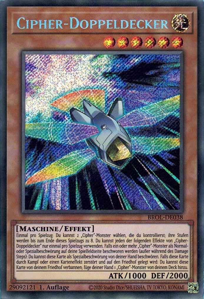 Einmal pro Spielzug: Du kannst 2 „Cipher“-Monster wählen, die du kontrollierst; ihre Stufen werden bis zum Ende dieses Spielzugs zu 8. Du kannst jeden der folgenden Effekte von „Cipher-Doppeldecker“ nur einmal pro Spielzug verwenden. Falls ein oder mehr „Cipher“-Monster als Normal- oder Spezialbeschwörung auf deine Spielfeldseite beschworen werden (außer während des Damage Steps): Du kannst diese Karte als Spezialbeschwörung von deiner Hand beschwören. Falls diese Karte durch Kampf oder einen Karteneffekt zerstört und auf den Friedhof gelegt wird: Du kannst diese Karte von deinem Friedhof verbannen; füge deiner Hand 1 „Cipher“-Monster von deinem Deck hinzu.