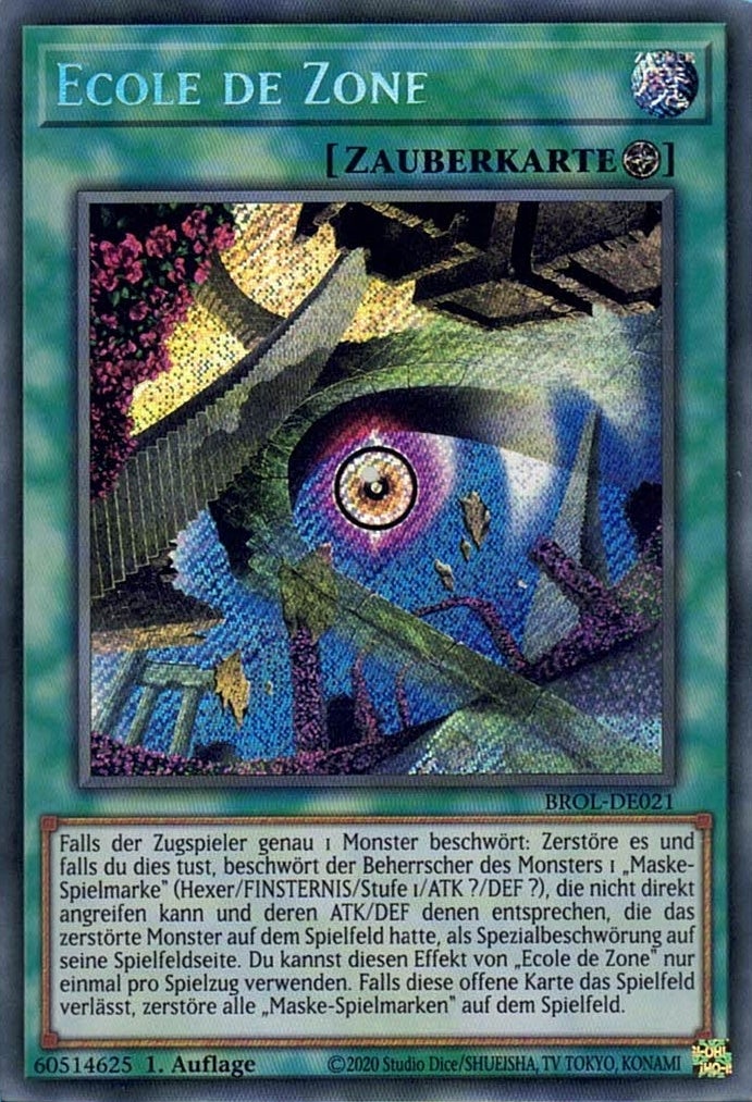 Falls der Zugspieler genau 1 Monster beschwört: Zerstöre es und falls du dies tust, beschwört der Beherrscher des Monsters 1 „Maske-Spielmarke“ (Hexer/FINSTERNIS/Stufe 1/ATK ?/DEF ?), die nicht direkt angreifen kann und deren ATK/DEF denen entsprechen, die das zerstörte Monster auf dem Spielfeld hatte, als Spezialbeschwörung auf seine Spielfeldseite. Du kannst diesen Effekt von „Ecole de Zone“ nur einmal pro Spielzug verwenden. Falls diese offene Karte das Spielfeld verlässt, zerstöre alle „Maske-Spielmarken“ auf dem Spielfeld.