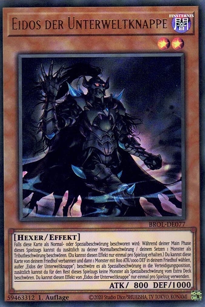 Falls diese Karte als Normal- oder Spezialbeschwörung beschworen wird: Während deiner Main Phase dieses Spielzugs kannst du zusätzlich zu deiner Normalbeschwörung / deinem Setzen 1 Monster als Tributbeschwörung beschwören. (Du kannst diesen Effekt nur einmal pro Spielzug erhalten.) Du kannst diese Karte von deinem Friedhof verbannen und dann 1 Monster mit 800 ATK/1000 DEF in deinem Friedhof wählen, außer „Eidos der Unterweltknappe“; beschwöre es als Spezialbeschwörung in die Verteidigungsposition, zusätzlich kannst du für den Rest dieses Spielzugs keine Monster als Spezialbeschwörung vom Extra Deck beschwören. Du kannst diesen Effekt von „Eidos der Unterweltknappe“ nur einmal pro Spielzug verwenden.