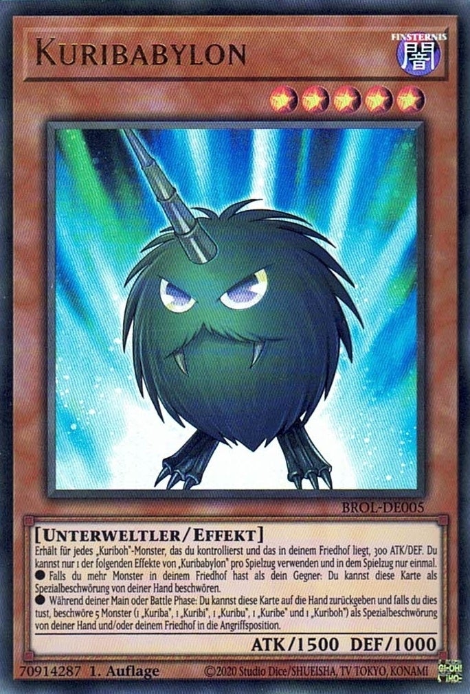 ●Während deiner Main oder Battle Phase: Du kannst diese Karte auf die Hand zurückgeben und falls du dies tust, beschwöre 5 Monster (1 „Kuriba“, 1 „Kuribi“, 1 „Kuribu“, 1 „Kuribe“ und 1 „Kuriboh“) als Spezialbeschwörung von deiner Hand und/oder deinem Friedhof in die Angriffsposition.