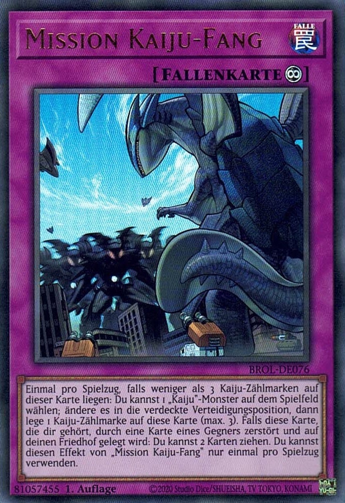 Einmal pro Spielzug, falls weniger als 3 Kaiju-Zählmarken auf dieser Karte liegen: Du kannst 1 „Kaiju“-Monster auf dem Spielfeld wählen; ändere es in die verdeckte Verteidigungsposition, dann lege 1 Kaiju-Zählmarke auf diese Karte (max. 3). Falls diese Karte, die dir gehört, durch eine Karte eines Gegners zerstört und auf deinen Friedhof gelegt wird: Du kannst 2 Karten ziehen. Du kannst diesen Effekt von „Mission Kaiju-Fang“ nur einmal pro Spielzug verwenden.