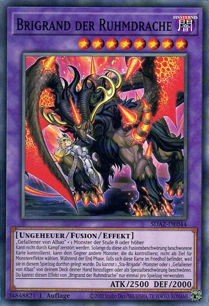 Kann nicht durch Kampf zerstört werden. Solange du diese als Fusionsbeschwörung beschworene Karte kontrollierst, kann dein Gegner andere Monster, die du kontrollierst, nicht als Ziel für Monstereffekte wählen. Während der End Phase, falls sich diese Karte im Friedhof befindet, weil sie in diesem Spielzug dorthin gelegt wurde: Du kannst 1 „Sta-Brigade“-Monster oder 1 „Gefallener von Albaz“ von deinem Deck deiner Hand hinzufügen oder als Spezialbeschwörung beschwören. Du kannst diesen Effekt von „Brigrand der Ruhmdrache“ nur einmal pro Spielzug verwenden.
