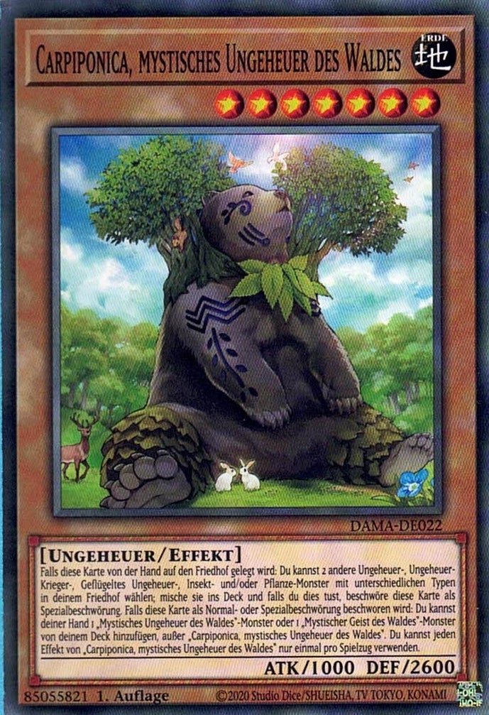 Falls diese Karte von der Hand auf den Friedhof gelegt wird: Du kannst 2 andere Ungeheuer-, Ungeheuer-Krieger-, Geflügeltes Ungeheuer-, Insekt- und/oder Pflanze-Monster mit unterschiedlichen Typen in deinem Friedhof wählen; mische sie ins Deck und falls du dies tust, beschwöre diese Karte als Spezialbeschwörung. Falls diese Karte als Normal- oder Spezialbeschwörung beschworen wird: Du kannst deiner Hand 1 „Mystisches Ungeheuer des Waldes“-Monster oder 1 „Mystischer Geist des Waldes“-Monster von deinem Deck hinzufügen, außer „Carpiponica, mystisches Ungeheuer des Waldes“. Du kannst jeden Effekt von „Carpiponica, mystisches Ungeheuer des Waldes“ nur einmal pro Spielzug verwenden.