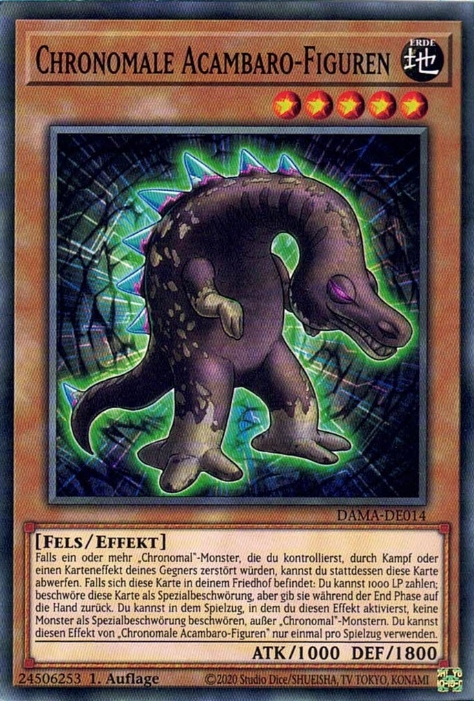 Falls ein oder mehr „Chronomal“-Monster, die du kontrollierst, durch Kampf oder einen Karteneffekt deines Gegners zerstört würden, kannst du stattdessen diese Karte abwerfen. Falls sich diese Karte in deinem Friedhof befindet: Du kannst 1000 LP zahlen; beschwöre diese Karte als Spezialbeschwörung, aber gib sie während der End Phase auf die Hand zurück. Du kannst in dem Spielzug, in dem du diesen Effekt aktivierst, keine Monster als Spezialbeschwörung beschwören, außer „Chronomal“-Monstern. Du kannst diesen Effekt von „Chronomale Acambaro-Figuren“ nur einmal pro Spielzug verwenden.
