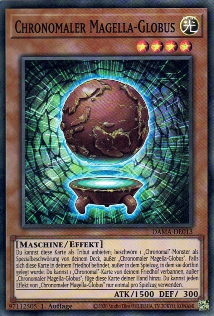 Du kannst diese Karte als Tribut anbieten; beschwöre 1 „Chronomal“-Monster als Spezialbeschwörung von deinem Deck, außer „Chronomaler Magella-Globus“. Falls sich diese Karte in deinem Friedhof befindet, außer in dem Spielzug, in dem sie dorthin gelegt wurde: Du kannst 1 „Chronomal“-Karte von deinem Friedhof verbannen, außer „Chronomaler Magella-Globus“; füge diese Karte deiner Hand hinzu. Du kannst jeden Effekt von „Chronomaler Magella-Globus“ nur einmal pro Spielzug verwenden.