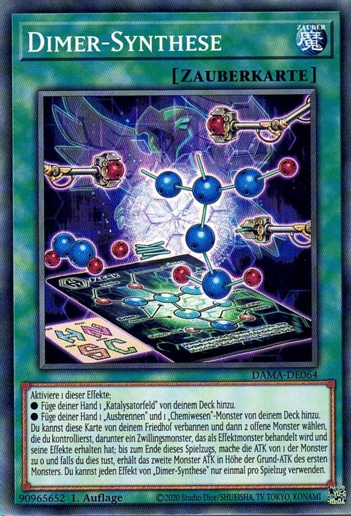 Du kannst diese Karte von deinem Friedhof verbannen und dann 2 offene Monster wählen, die du kontrollierst, darunter ein Zwillingsmonster, das als Effektmonster behandelt wird und seine Effekte erhalten hat; bis zum Ende dieses Spielzugs, mache die ATK von 1 der Monster zu 0 und falls du dies tust, erhält das zweite Monster ATK in Höhe der Grund-ATK des ersten Monsters. Du kannst jeden Effekt von „Dimer-Synthese“ nur einmal pro Spielzug verwenden.