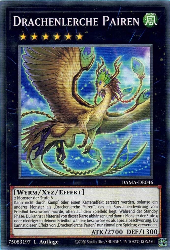 Kann nicht durch Kampf oder einen Karteneffekt zerstört werden, solange ein anderes Monster als „Drachenlerche Pairen“, das als Spezialbeschwörung vom Friedhof beschworen wurde, offen auf dem Spielfeld liegt. Während der Standby Phase: Du kannst 1 Material von dieser Karte abhängen und dann 1 Monster der Stufe 5 oder niedriger in deinem Friedhof wählen; beschwöre es als Spezialbeschwörung. Du kannst diesen Effekt von „Drachenlerche Pairen“ nur einmal pro Spielzug verwenden.
