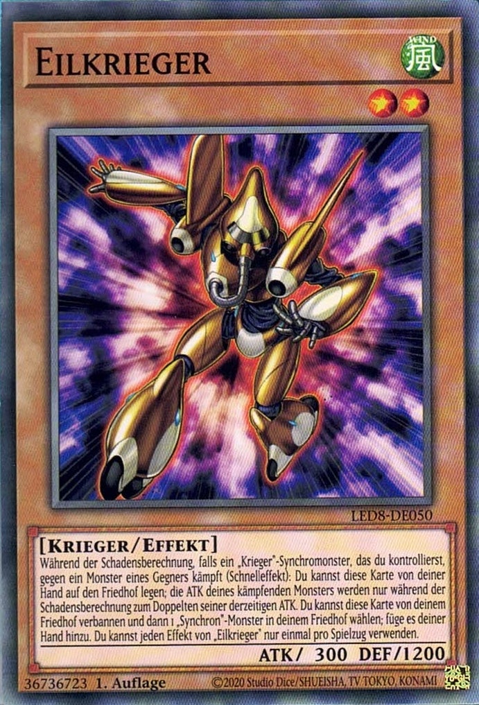 Während der Schadensberechnung, falls ein „Krieger“-Synchromonster, das du kontrollierst, gegen ein Monster eines Gegners kämpft (Schnelleffekt): Du kannst diese Karte von deiner Hand auf den Friedhof legen; die ATK deines kämpfenden Monsters werden nur während der Schadensberechnung zum Doppelten seiner derzeitigen ATK. Du kannst diese Karte von deinem Friedhof verbannen und dann 1 „Synchron“-Monster in deinem Friedhof wählen; füge es deiner Hand hinzu. Du kannst jeden Effekt von „Eilkrieger“ nur einmal pro Spielzug verwenden.