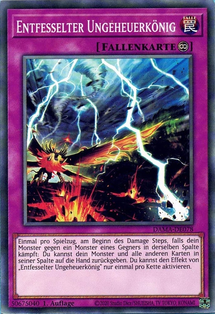 Einmal pro Spielzug, am Beginn des Damage Steps, falls dein Monster gegen ein Monster eines Gegners in derselben Spalte kämpft: Du kannst dein Monster und alle anderen Karten in seiner Spalte auf die Hand zurückgeben. Du kannst den Effekt von „Entfesselter Ungeheuerkönig“ nur einmal pro Kette aktivieren.