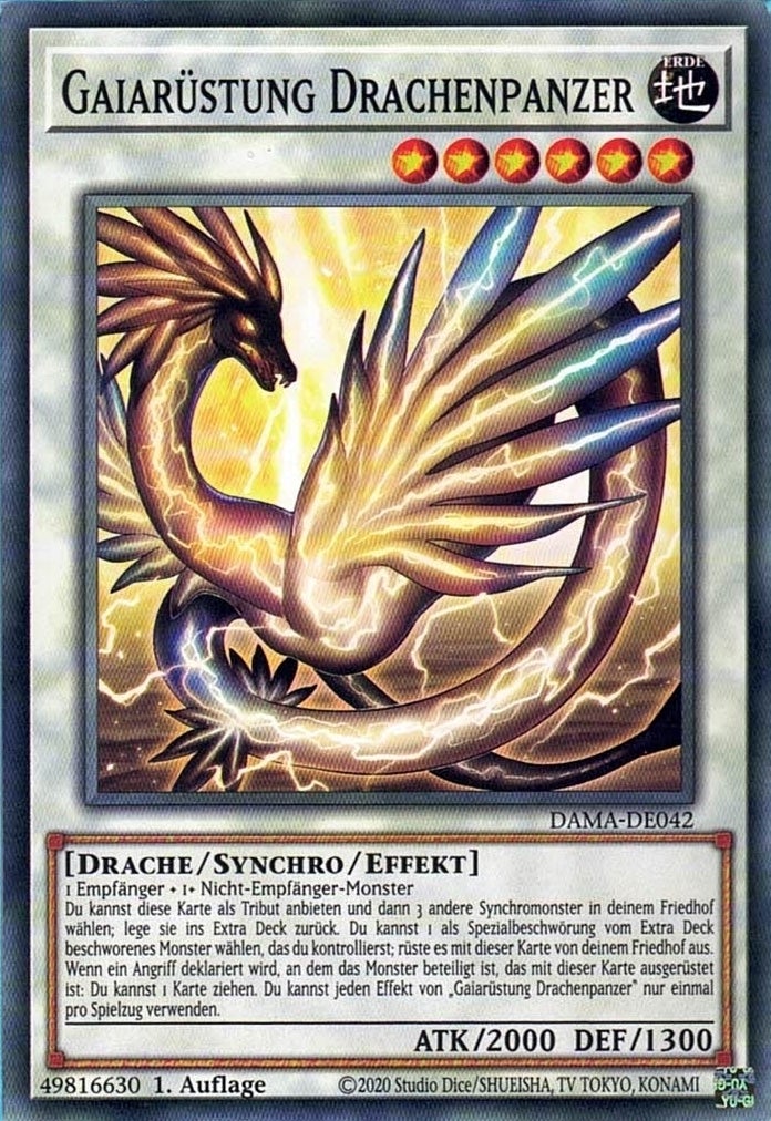Wenn ein Angriff deklariert wird, an dem das Monster beteiligt ist, das mit dieser Karte ausgerüstet ist: Du kannst 1 Karte ziehen. Du kannst jeden Effekt von „Gaiarüstung Drachenpanzer“ nur einmal pro Spielzug verwenden.