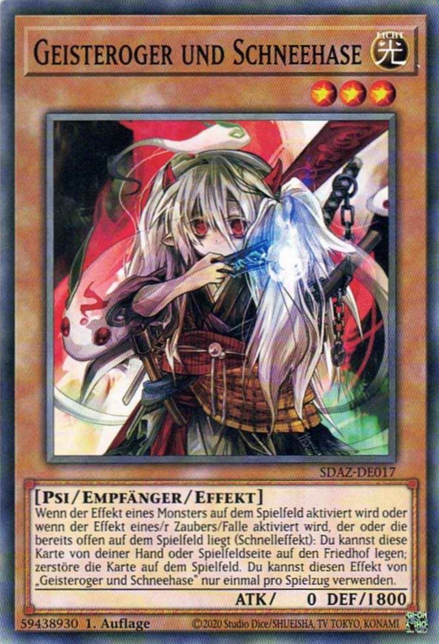 Wenn der Effekt eines Monsters auf dem Spielfeld aktiviert wird oder wenn der Effekt eines/r Zaubers/Falle aktiviert wird, der oder die bereits offen auf dem Spielfeld liegt (Schnelleffekt): Du kannst diese Karte von deiner Hand oder Spielfeldseite auf den Friedhof legen; zerstöre die Karte auf dem Spielfeld. Du kannst diesen Effekt von „Geisteroger und Schneehase“ nur einmal pro Spielzug verwenden.