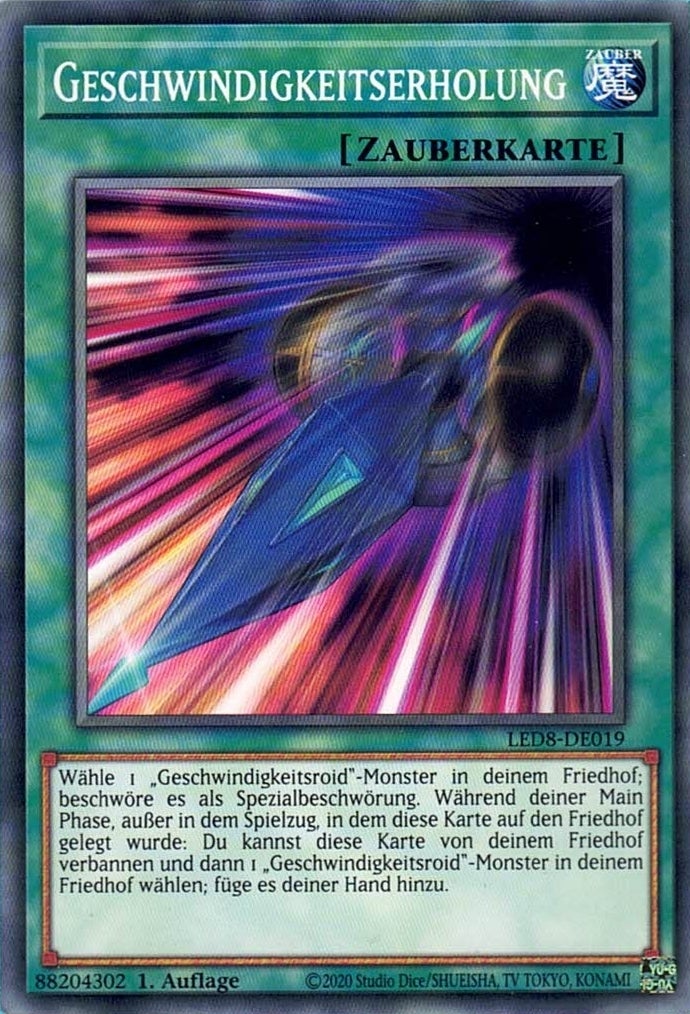 Wähle 1 „Geschwindigkeitsroid“-Monster in deinem Friedhof; beschwöre es als Spezialbeschwörung. Während deiner Main Phase, außer in dem Spielzug, in dem diese Karte auf den Friedhof gelegt wurde: Du kannst diese Karte von deinem Friedhof verbannen und dann 1 „Geschwindigkeitsroid“-Monster in deinem Friedhof wählen; füge es deiner Hand hinzu.