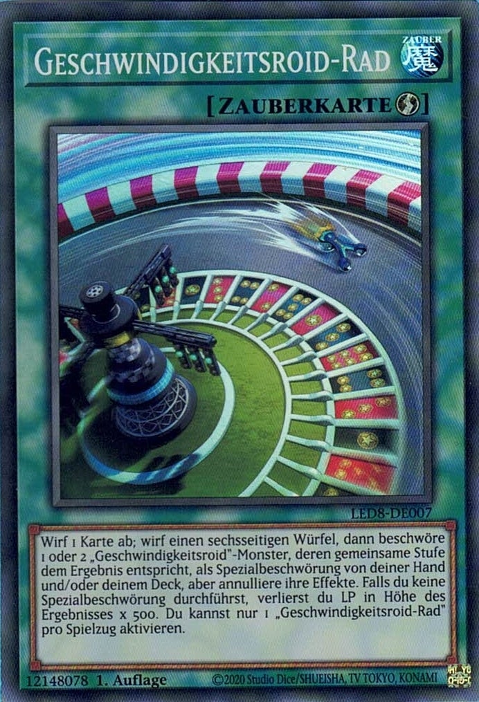 Wirf 1 Karte ab; wirf einen sechsseitigen Würfel, dann beschwöre 1 oder 2 „Geschwindigkeitsroid“-Monster, deren gemeinsame Stufe dem Ergebnis entspricht, als Spezialbeschwörung von deiner Hand und/oder deinem Deck, aber annulliere ihre Effekte. Falls du keine Spezialbeschwörung durchführst, verlierst du LP in Höhe des Ergebnisses x 500. Du kannst nur 1 „Geschwindigkeitsroid-Rad“ pro Spielzug aktivieren.