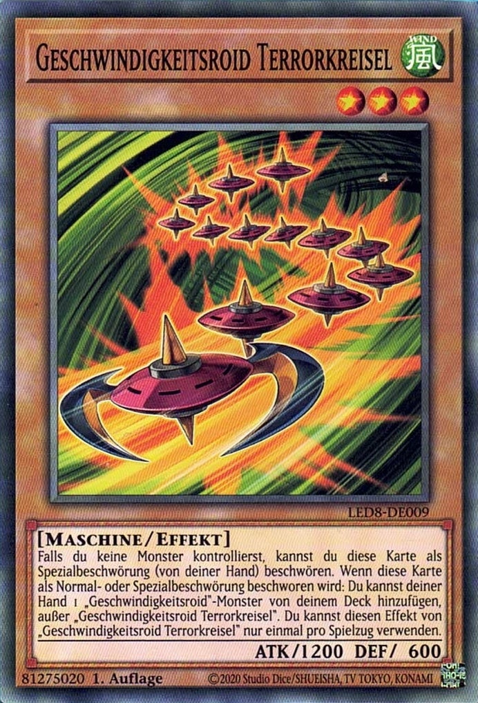 Falls du keine Monster kontrollierst, kannst du diese Karte als Spezialbeschwörung (von deiner Hand) beschwören. Wenn diese Karte als Normal- oder Spezialbeschwörung beschworen wird: Du kannst deiner Hand 1 „Geschwindigkeitsroid“-Monster von deinem Deck hinzufügen, außer „Geschwindigkeitsroid Terrorkreisel“. Du kannst diesen Effekt von „Geschwindigkeitsroid Terrorkreisel“ nur einmal pro Spielzug verwenden.