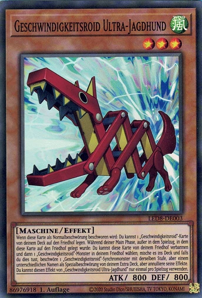 Wenn diese Karte als Normalbeschwörung beschworen wird: Du kannst 1 „Geschwindigkeitsroid“-Karte von deinem Deck auf den Friedhof legen. Während deiner Main Phase, außer in dem Spielzug, in dem diese Karte auf den Friedhof gelegt wurde: Du kannst diese Karte von deinem Friedhof verbannen und dann 1 „Geschwindigkeitsroid“-Monster in deinem Friedhof wählen; mische es ins Deck und falls du dies tust, beschwöre 1 „Geschwindigkeitsroid“-Synchromonster mit derselben Stufe, aber einem unterschiedlichen Namen als Spezialbeschwörung von deinem Extra Deck, aber annulliere seine Effekte. Du kannst diesen Effekt von „Geschwindigkeitsroid Ultra-Jagdhund“ nur einmal pro Spielzug verwenden.