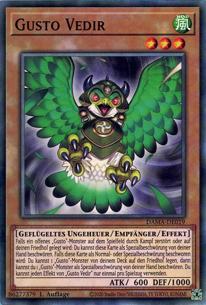 Falls ein offenes „Gusto“-Monster auf dem Spielfeld durch Kampf zerstört oder auf deinen Friedhof gelegt wird: Du kannst diese Karte als Spezialbeschwörung von deiner Hand beschwören. Falls diese Karte als Normal- oder Spezialbeschwörung beschworen wird: Du kannst 1 „Gusto“-Monster von deinem Deck auf den Friedhof legen, dann kannst du 1 „Gusto“-Monster als Spezialbeschwörung von deiner Hand beschwören. Du kannst jeden Effekt von „Gusto Vedir“ nur einmal pro Spielzug verwenden.