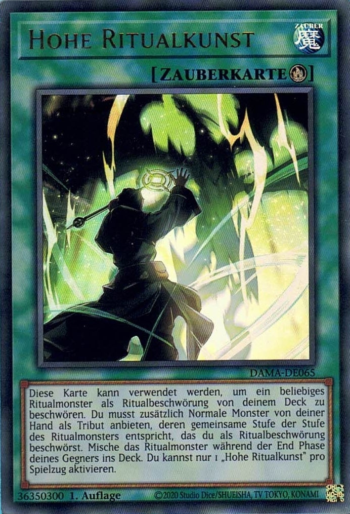 Diese Karte kann verwendet werden, um ein beliebiges Ritualmonster als Ritualbeschwörung von deinem Deck zu beschwören. Du musst zusätzlich Normale Monster von deiner Hand als Tribut anbieten, deren gemeinsame Stufe der Stufe des Ritualmonsters entspricht, das du als Ritualbeschwörung beschwörst. Mische das Ritualmonster während der End Phase deines Gegners ins Deck. Du kannst nur 1 „Hohe Ritualkunst“ pro Spielzug aktivieren.