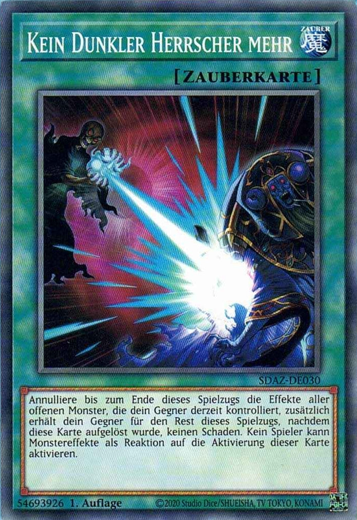 Annulliere bis zum Ende dieses Spielzugs die Effekte aller offenen Monster, die dein Gegner derzeit kontrolliert, zusätzlich erhält dein Gegner für den Rest dieses Spielzugs, nachdem diese Karte aufgelöst wurde, keinen Schaden. Kein Spieler kann Monstereffekte als Reaktion auf die Aktivierung dieser Karte aktivieren.