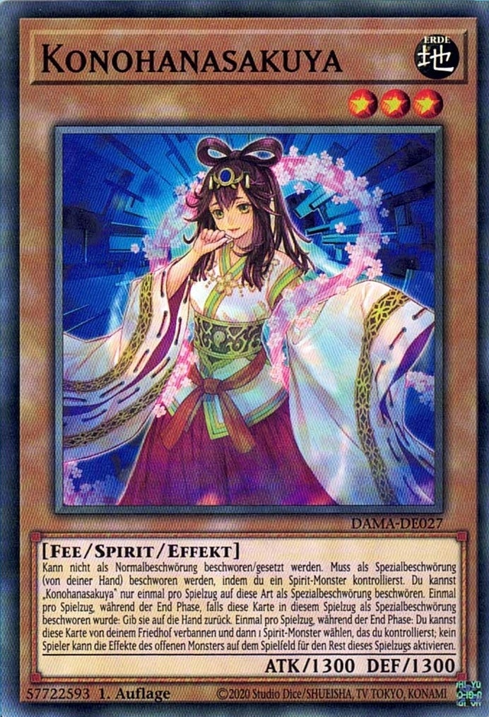 Kann nicht als Normalbeschwörung beschworen/gesetzt werden. Muss als Spezialbeschwörung (von deiner Hand) beschworen werden, indem du ein Spirit-Monster kontrollierst. Du kannst „Konohanasakuya“ nur einmal pro Spielzug auf diese Art als Spezialbeschwörung beschwören. Einmal pro Spielzug, während der End Phase, falls diese Karte in diesem Spielzug als Spezialbeschwörung beschworen wurde: Gib sie auf die Hand zurück. Einmal pro Spielzug, während der End Phase: Du kannst diese Karte von deinem Friedhof verbannen und dann 1 Spirit-Monster wählen, das du kontrollierst; kein Spieler kann die Effekte des offenen Monsters auf dem Spielfeld für den Rest dieses Spielzugs aktivieren.