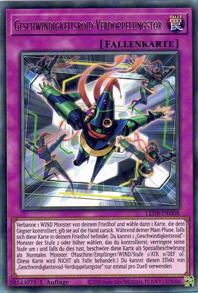 Verbanne 1 WIND Monster von deinem Friedhof und wähle dann 1 Karte, die dein Gegner kontrolliert; gib sie auf die Hand zurück. Während deiner Main Phase, falls sich diese Karte in deinem Friedhof befindet: Du kannst 1 „Geschwindigkeitsroid“-Monster der Stufe 2 oder höher wählen, das du kontrollierst; verringere seine Stufe um 1 und falls du dies tust, beschwöre diese Karte als Spezialbeschwörung als Normales Monster (Maschine/Empfänger/WIND/Stufe 1/ATK 0/DEF 0). (Diese Karte wird NICHT als Falle behandelt.) Du kannst diesen Effekt von „Geschwindigkeitsroid-Verdoppelungstor“ nur einmal pro Duell verwenden.