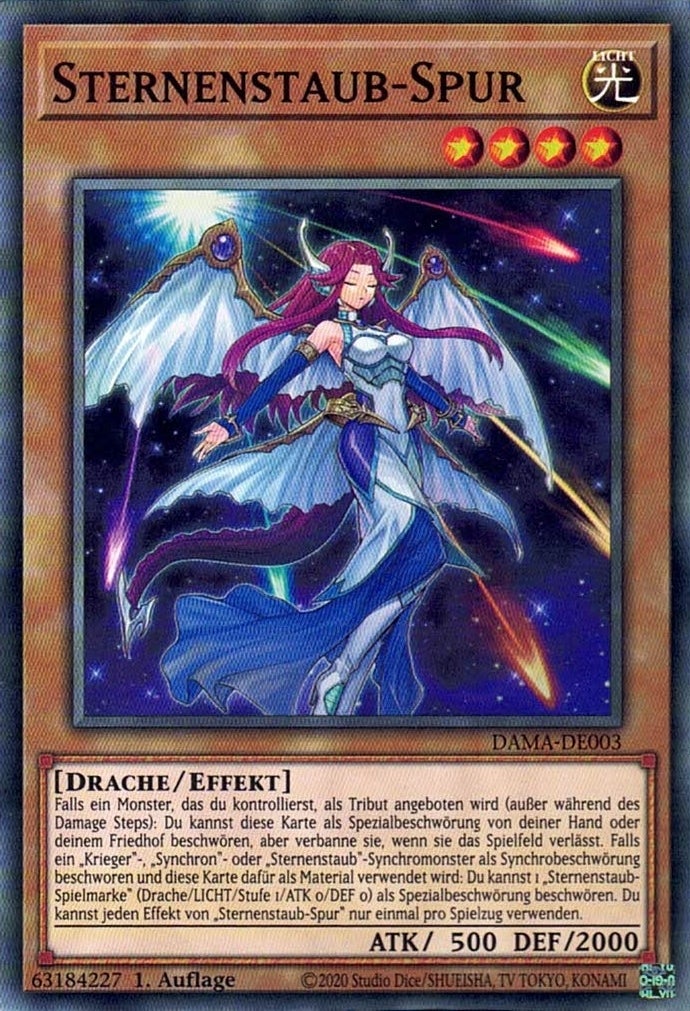 Falls ein Monster, das du kontrollierst, als Tribut angeboten wird (außer während des Damage Steps): Du kannst diese Karte als Spezialbeschwörung von deiner Hand oder deinem Friedhof beschwören, aber verbanne sie, wenn sie das Spielfeld verlässt. Falls ein „Krieger“-, „Synchron“- oder „Sternenstaub“-Synchromonster als Synchrobeschwörung beschworen und diese Karte dafür als Material verwendet wird: Du kannst 1 „Sternenstaub-Spielmarke“ (Drache/LICHT/Stufe 1/ATK 0/DEF 0) als Spezialbeschwörung beschwören. Du kannst jeden Effekt von „Sternenstaub-Spur“ nur einmal pro Spielzug verwenden.