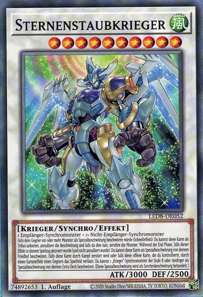 Falls dein Gegner ein oder mehr Monster als Spezialbeschwörung beschwören würde (Schnelleffekt): Du kannst diese Karte als Tribut anbieten; annulliere die Beschwörung und falls du dies tust, zerstöre die Monster. Während der End Phase, falls dieser Effekt in diesem Spielzug aktiviert wurde (und nicht annulliert wurde): Du kannst diese Karte als Spezialbeschwörung von deinem Friedhof beschwören. Falls diese Karte durch Kampf zerstört wird oder falls diese offene Karte, die du kontrollierst, durch einen Karteneffekt eines Gegners das Spielfeld verlässt: Du kannst 1 „Krieger“-Synchromonster der Stufe 8 oder niedriger als Spezialbeschwörung von deinem Extra Deck beschwören. (Diese Spezialbeschwörung wird als Synchrobeschwörung behandelt.)