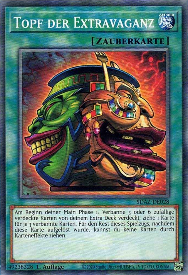 Am Beginn deiner Main Phase 1: Verbanne 3 oder 6 zufällige verdeckte Karten von deinem Extra Deck verdeckt; ziehe 1 Karte für je 3 verbannte Karten. Für den Rest dieses Spielzugs, nachdem diese Karte aufgelöst wurde, kannst du keine Karten durch Karteneffekte ziehen.