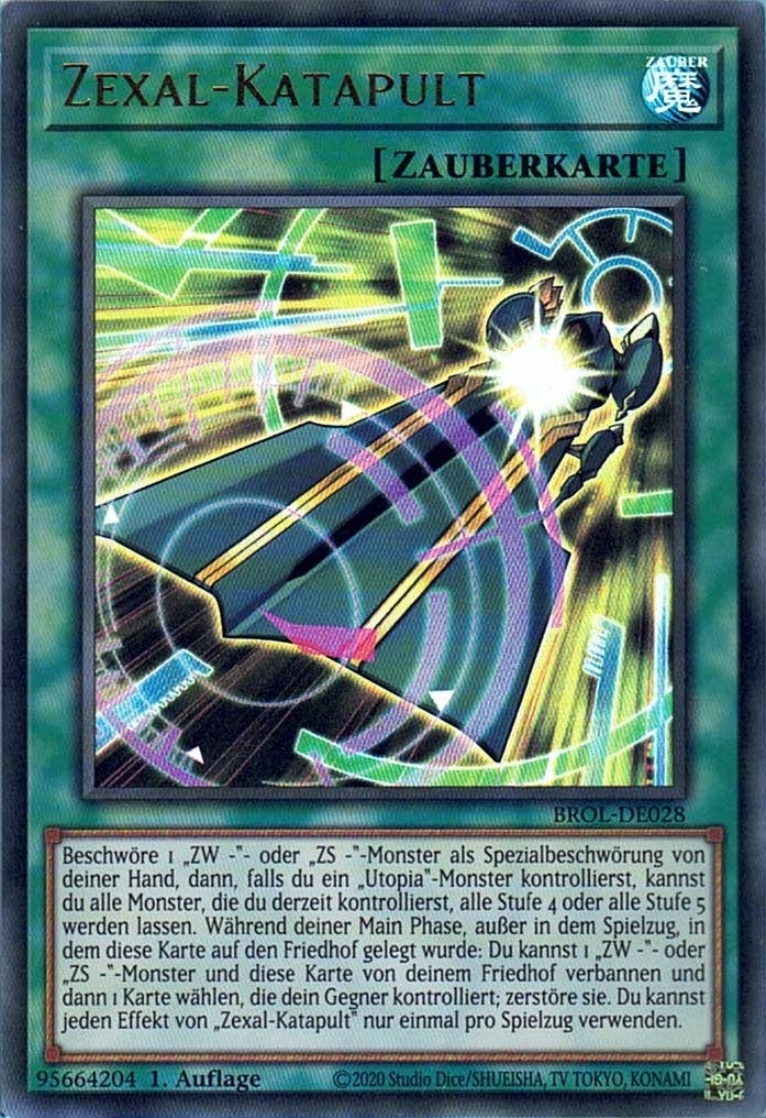 Beschwöre 1 „ZW -“- oder „ZS -“-Monster als Spezialbeschwörung von deiner Hand, dann, falls du ein „Utopia“-Monster kontrollierst, kannst du alle Monster, die du derzeit kontrollierst, alle Stufe 4 oder alle Stufe 5 werden lassen. Während deiner Main Phase, außer in dem Spielzug, in dem diese Karte auf den Friedhof gelegt wurde: Du kannst 1 „ZW -“- oder „ZS -“-Monster und diese Karte von deinem Friedhof verbannen und dann 1 Karte wählen, die dein Gegner kontrolliert; zerstöre sie. Du kannst jeden Effekt von „Zexal-Katapult“ nur einmal pro Spielzug verwenden.