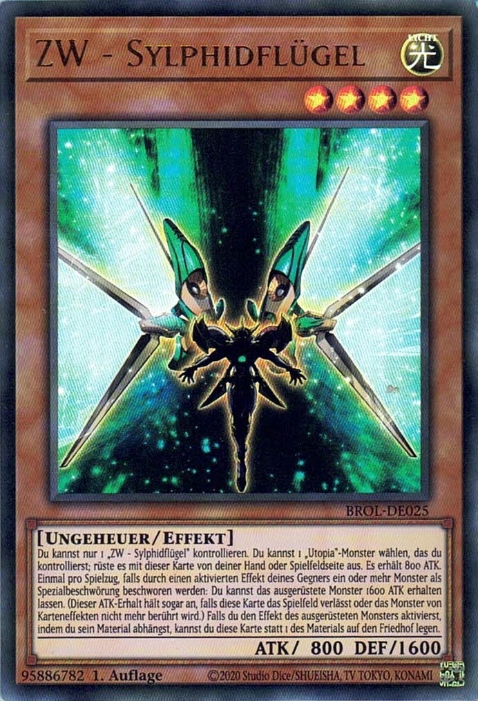 Du kannst nur 1 „ZW - Sylphidflügel“ kontrollieren. Du kannst 1 „Utopia“-Monster wählen, das du kontrollierst; rüste es mit dieser Karte von deiner Hand oder Spielfeldseite aus. Es erhält 800 ATK. Einmal pro Spielzug, falls durch einen aktivierten Effekt deines Gegners ein oder mehr Monster als Spezialbeschwörung beschworen werden: Du kannst das ausgerüstete Monster 1600 ATK erhalten lassen. (Dieser ATK-Erhalt hält sogar an, falls diese Karte das Spielfeld verlässt oder das Monster von Karteneffekten nicht mehr berührt wird.) Falls du den Effekt des ausgerüsteten Monsters aktivierst, indem du sein Material abhängst, kannst du diese Karte statt 1 des Materials auf den Friedhof legen.